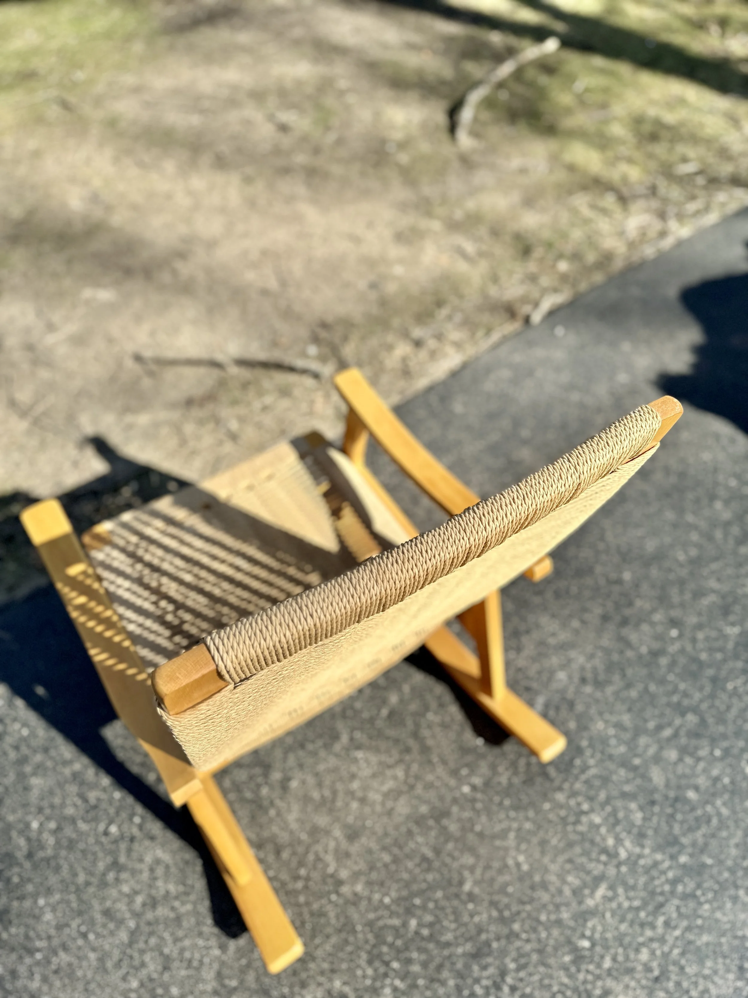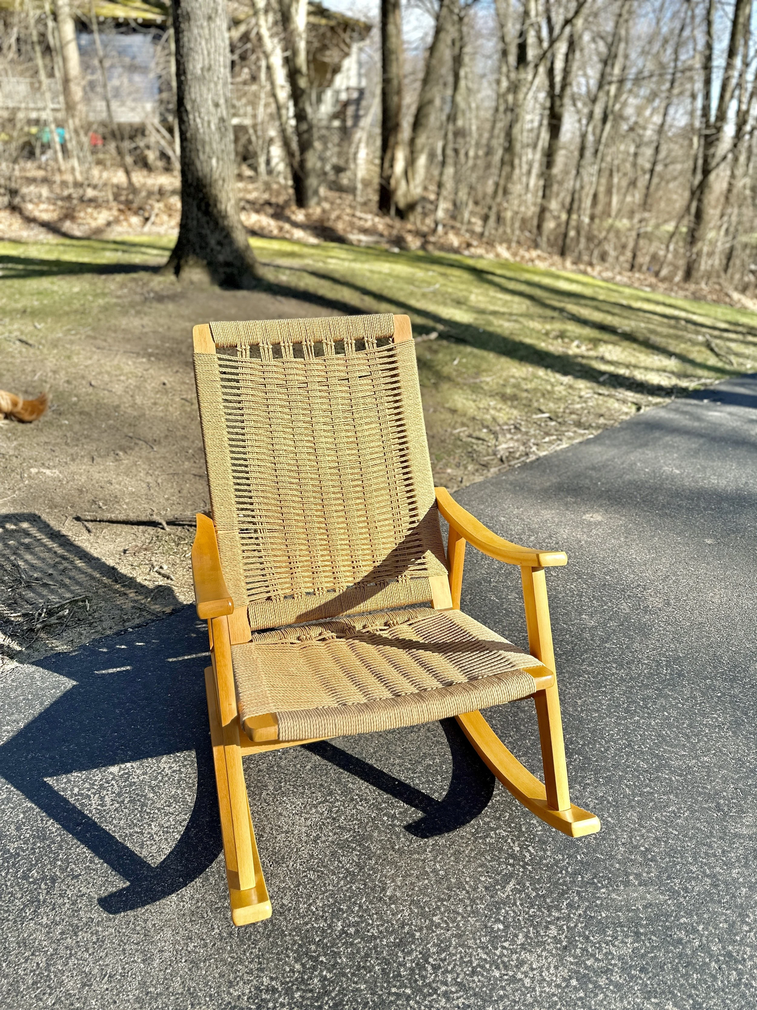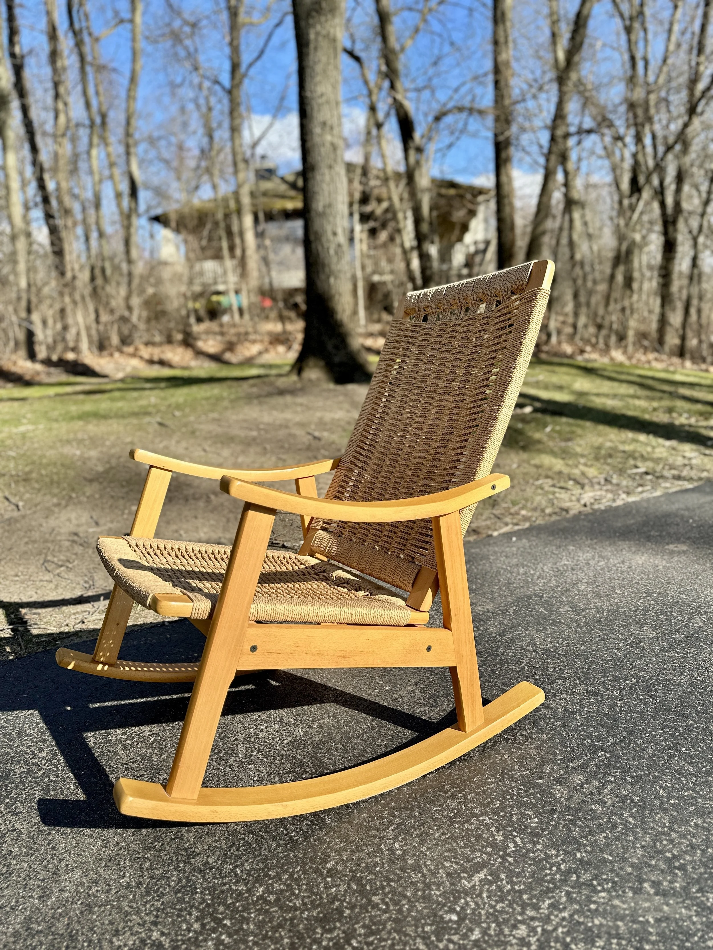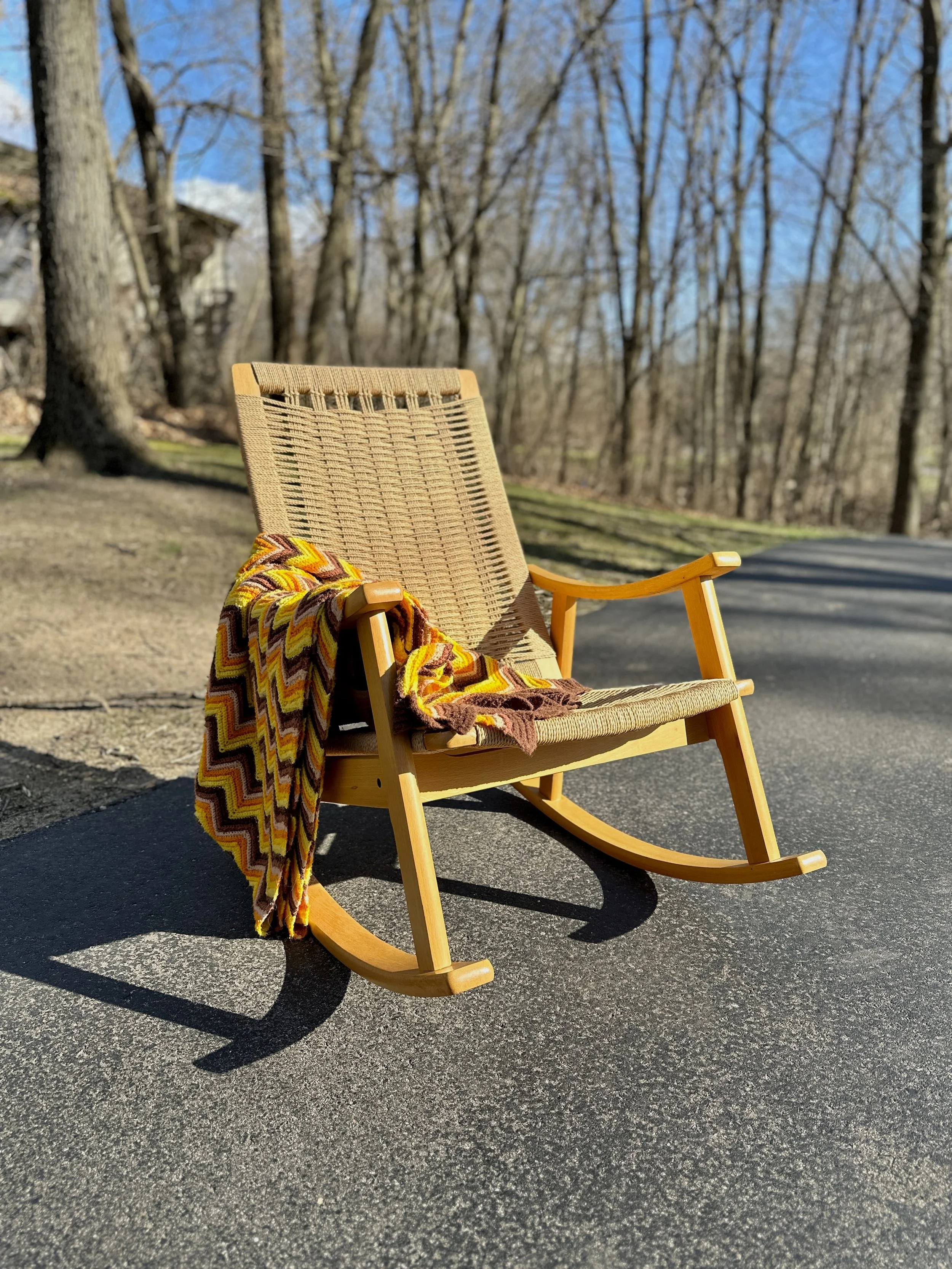 This vintage rope rocking chair in the style of Hans Wegner is made of quality materials in Yugoslavia. It’s a cozy, sturdy chair and rocks smoothly. Good vintage condition with no major wear of note.