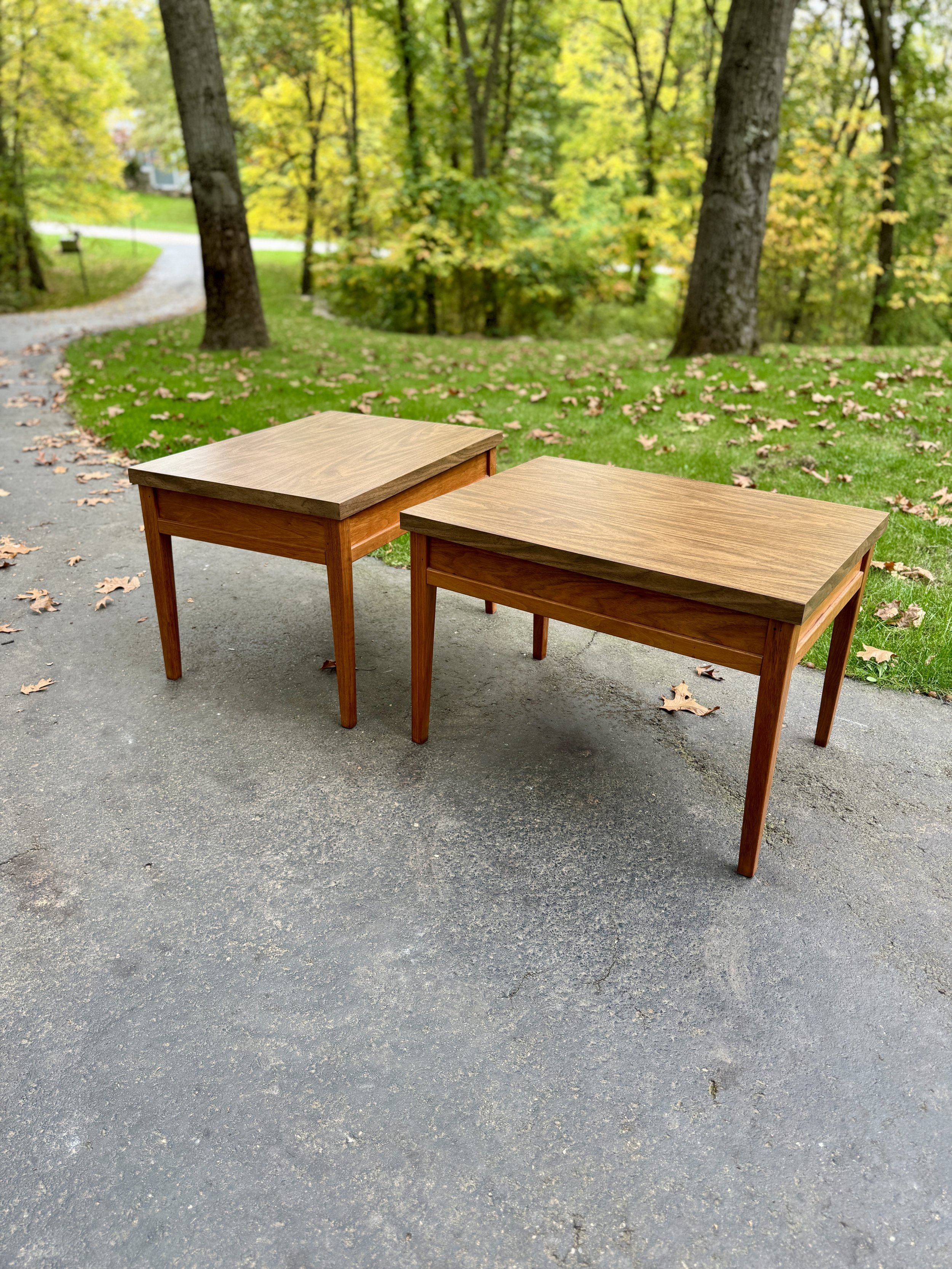 These side tables have a simple Danish Modern style with a warm medium finish on the walnut base. The tops are a durable faux wood Formica that can withstand lots of use without a coaster! They are in good vintage condition with minimal wear for their age (no major damage of note).